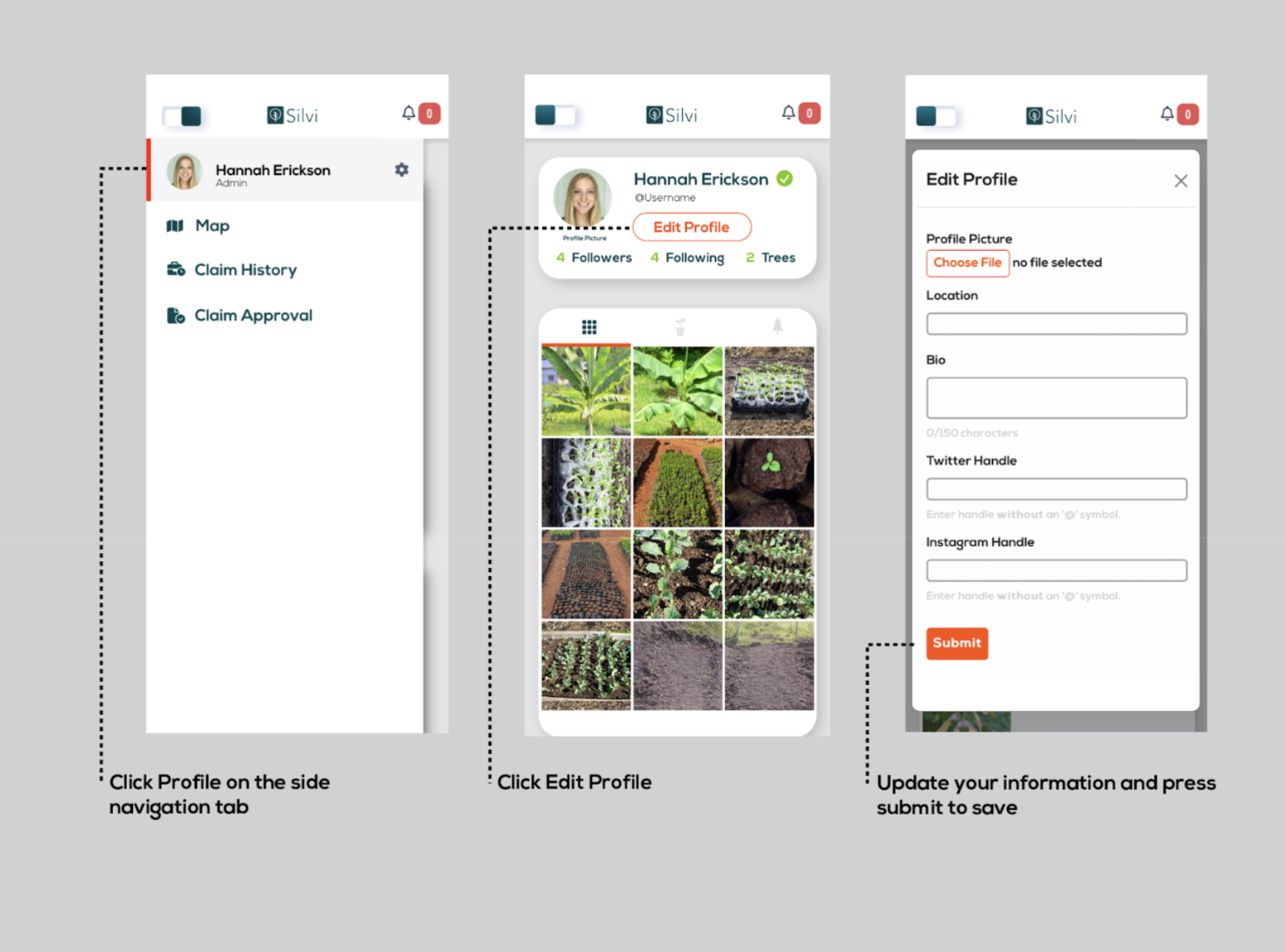 3. **Update** your profile information and **press** `submit` to **save.**